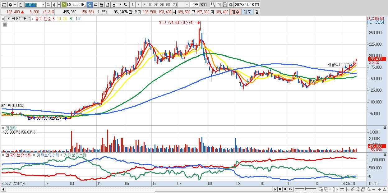 - LS ELECTRIC (193,400원 ▲ 3.31% , 시총: 58,020억, 거래량: 495,060, 거래대금:962억)