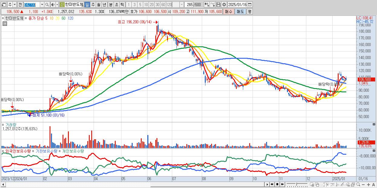 - 한미반도체 (106,500원 ▲ 1.04% , 시총: 102,894억, 거래량: 1,257,012, 거래대금:1,361억)