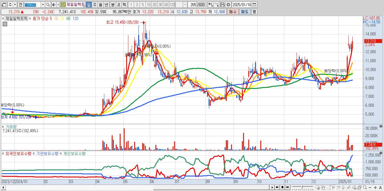 - 제일일렉트릭 (13,210원 ▲ 2.24% , 시총: 2,935억, 거래량: 7,241,413, 거래대금:959억)