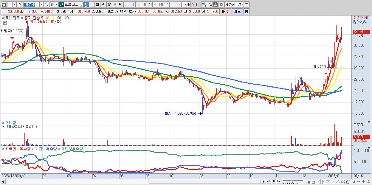 - 로보티즈 (33,050원 ▲ 7.48% , 시총: 4,316억, 거래량: 3,090,464, 거래대금:1,021억)