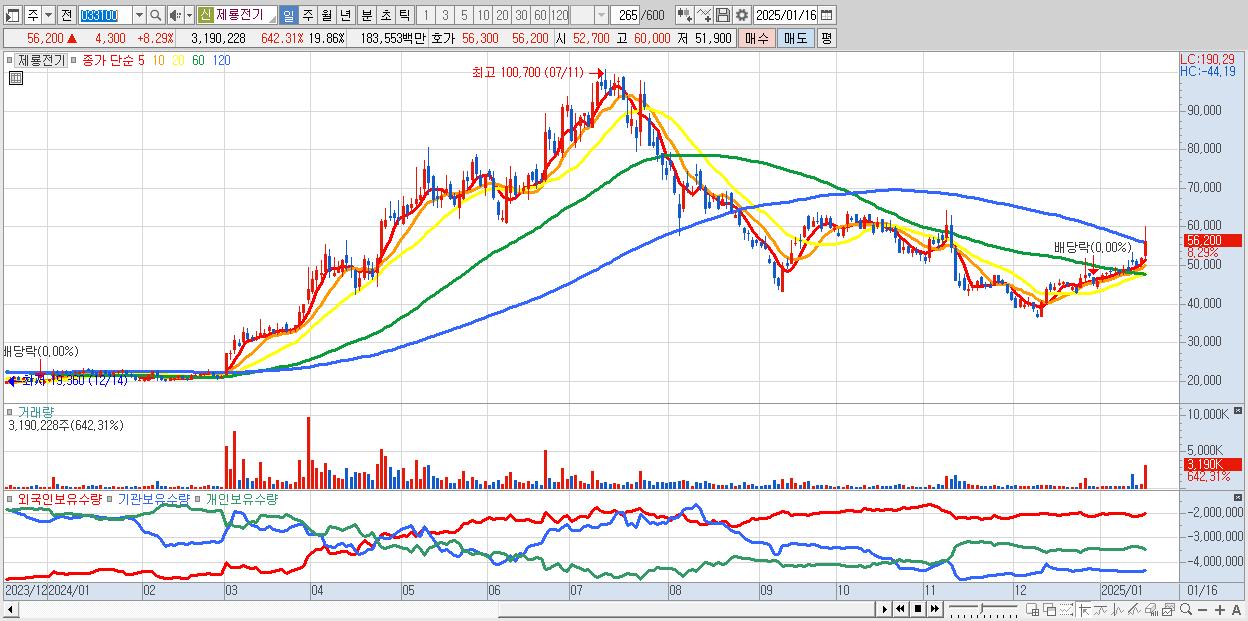 - 제룡전기 (56,200원 ▲ 8.29% , 시총: 9,027억, 거래량: 3,190,228, 거래대금:1,836억)