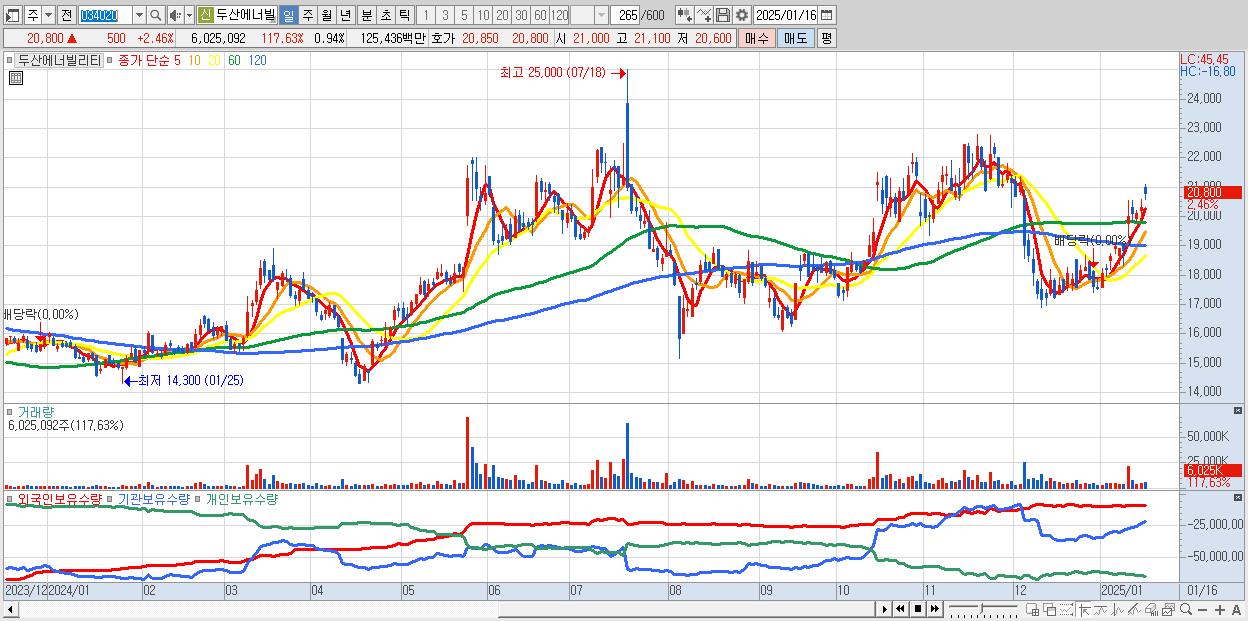 - 두산에너빌리티 (20,800원 ▲ 2.46% , 시총: 133,237억, 거래량: 6,025,092, 거래대금:1,254억)