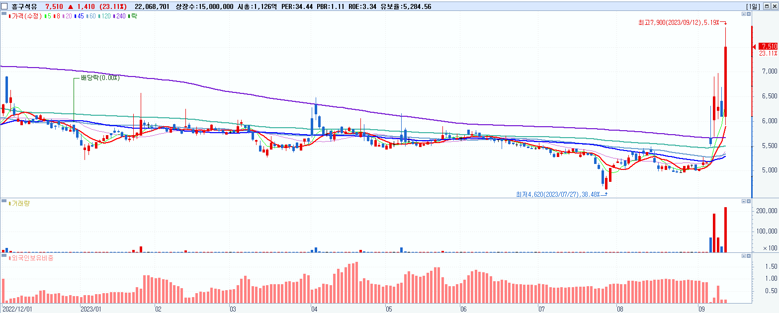 - 흥구석유 (7,510원 ▲ 23.11% , 시총: 1,127억, 거래량: 22,103,942, 거래대금:1,554억)