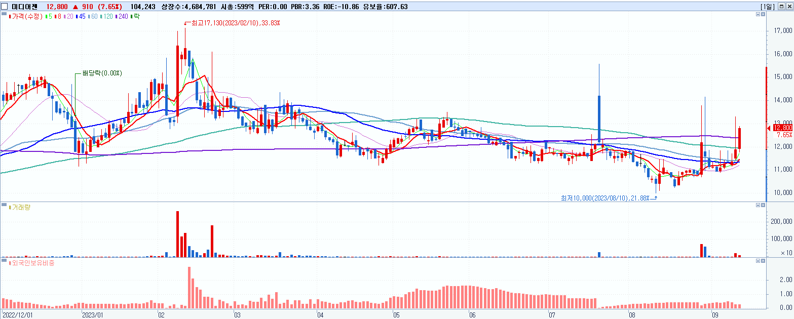 - 미디어젠 (12,800원 ▲ 7.65% , 시총: 600억, 거래량: 104,243, 거래대금:13억)