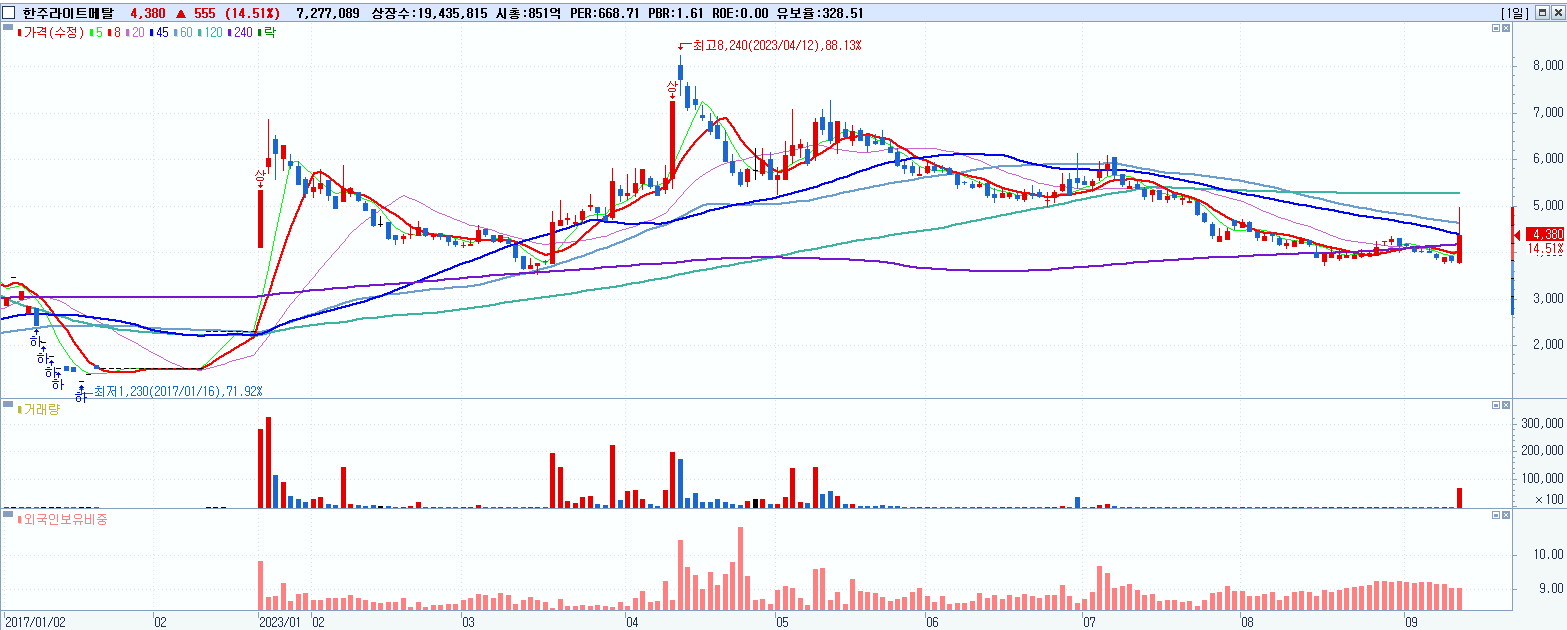 - 한주라이트메탈 (4,380원 ▲ 14.51% , 시총: 851억, 거래량: 7,293,462, 거래대금:339억)