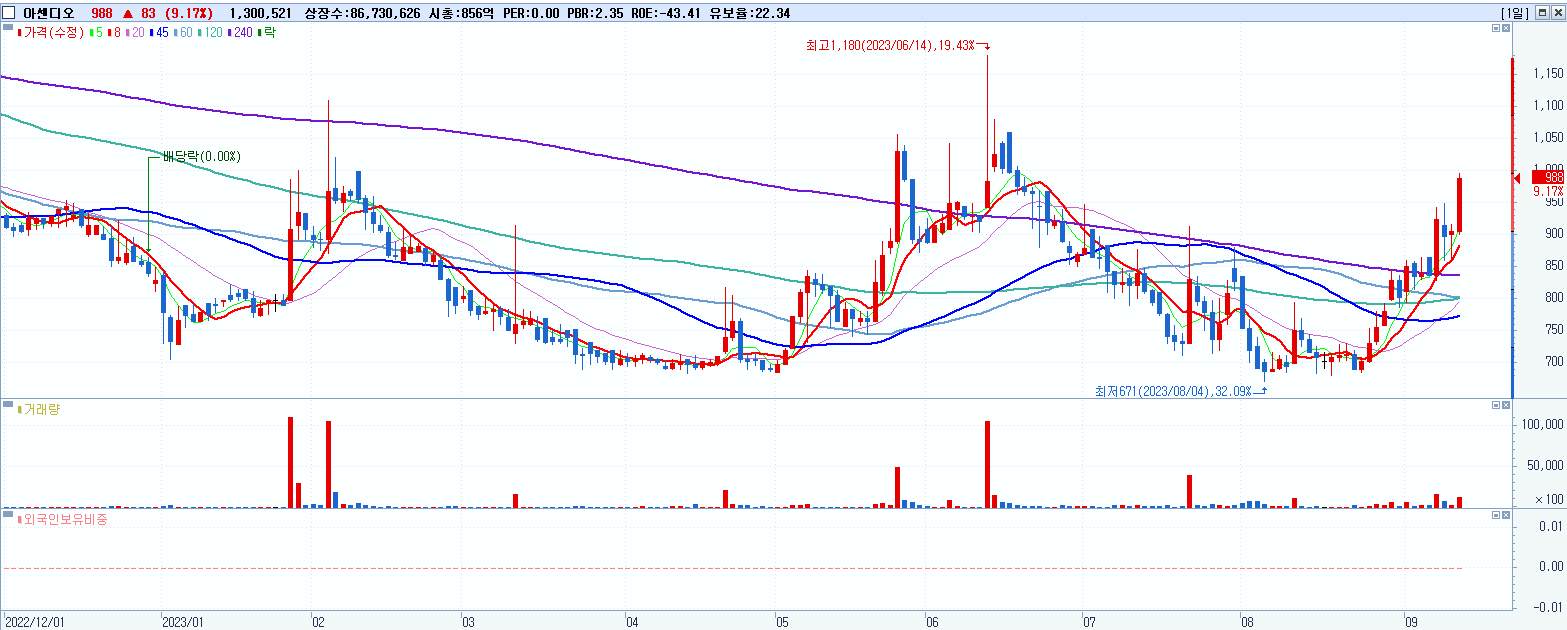 - 아센디오 (988원 ▲ 9.17% , 시총: 857억, 거래량: 1,300,522, 거래대금:13억)