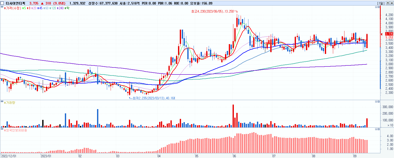 - 티사이언티픽 (3,735원 ▲ 9.05% , 시총: 2,517억, 거래량: 1,330,046, 거래대금:49억)