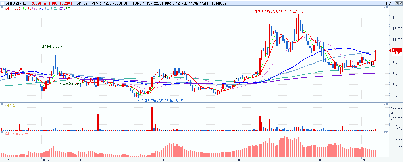 - 지오엘리먼트 (13,070원 ▲ 8.29% , 시총: 1,649억, 거래량: 341,851, 거래대금:44억)