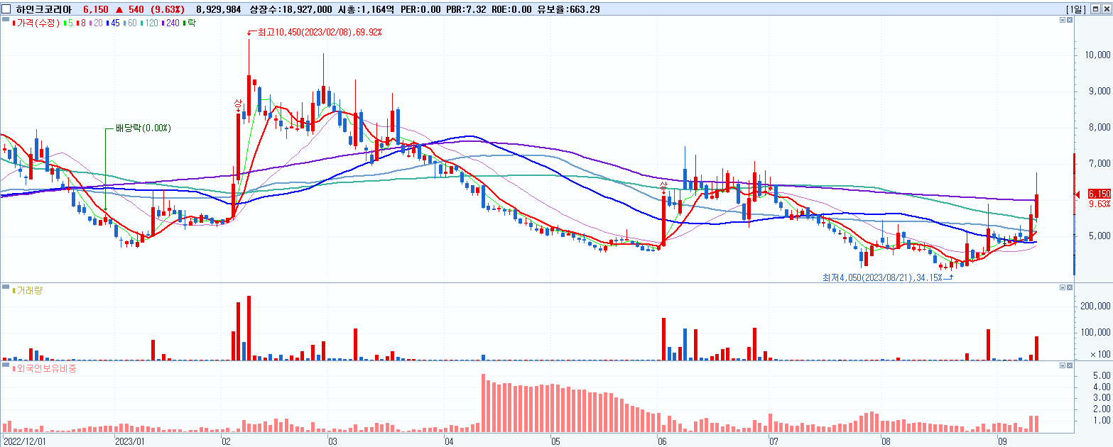 - 하인크코리아 (6,150원 ▲ 9.63% , 시총: 1,164억, 거래량: 8,931,122, 거래대금:573억)