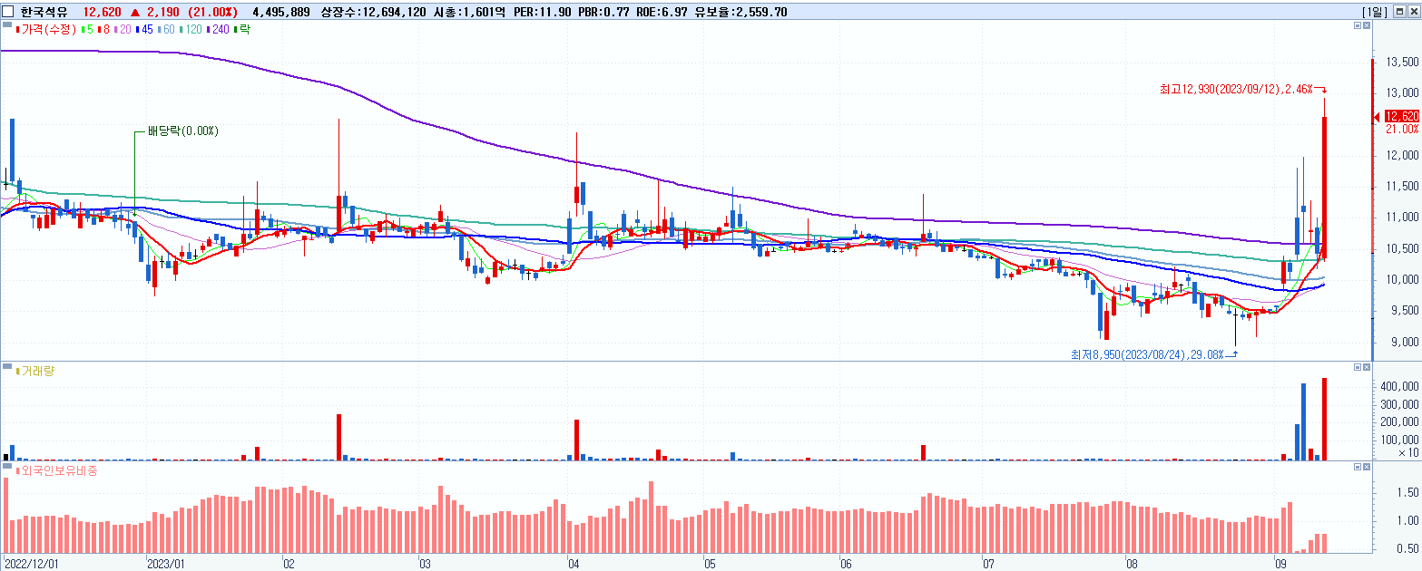- 한국석유 (12,620원 ▲ 21% , 시총: 1,602억, 거래량: 4,506,994, 거래대금:533억)