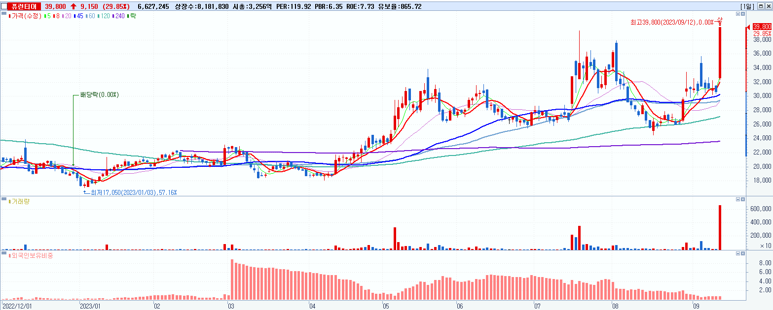 - 퓨런티어 (39,800원 ▲ 29.85% , 시총: 3,256억, 거래량: 6,627,350, 거래대금:2,497억)