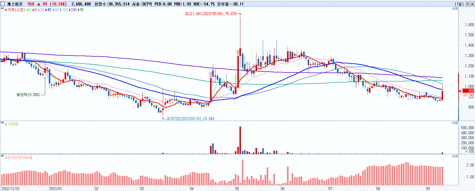 - 케스피온 (958원 ▲ 10.24% , 시총: 367억, 거래량: 2,686,489, 거래대금:26억)