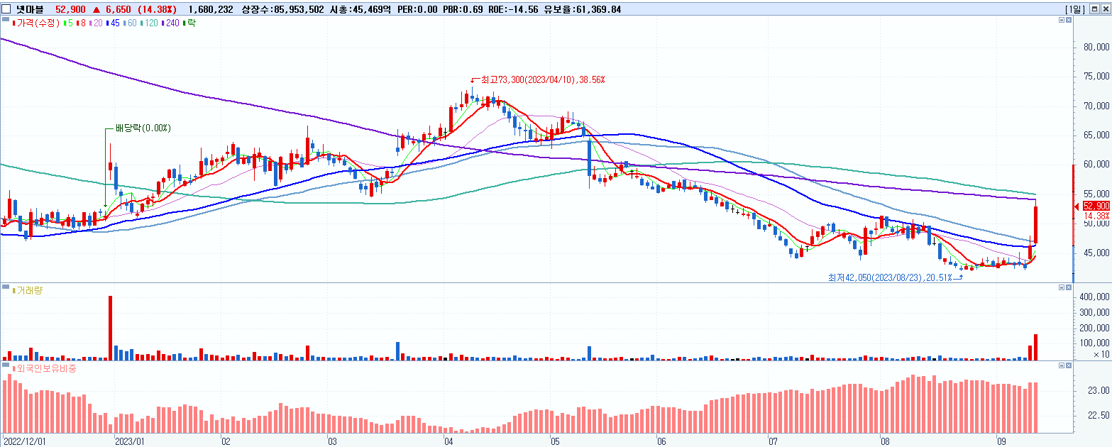 - 넷마블 (52,900원 ▲ 14.38% , 시총: 45,469억, 거래량: 1,681,817, 거래대금:864억)