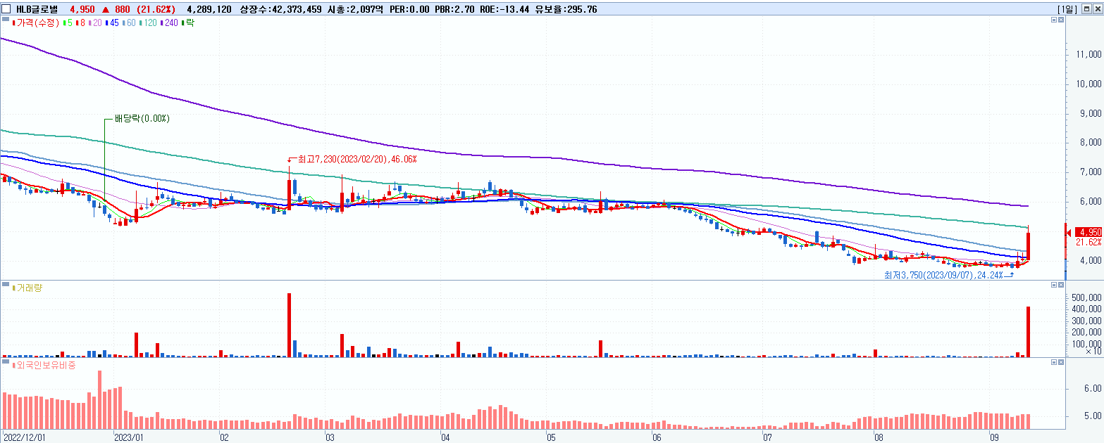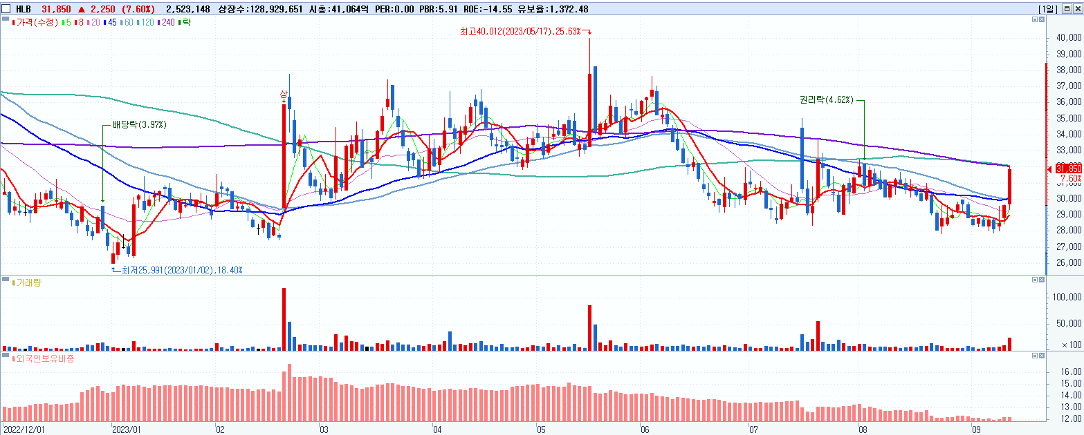 - HLB (31,850원 ▲ 7.6% , 시총: 41,064억, 거래량: 2,538,826, 거래대금:775억)