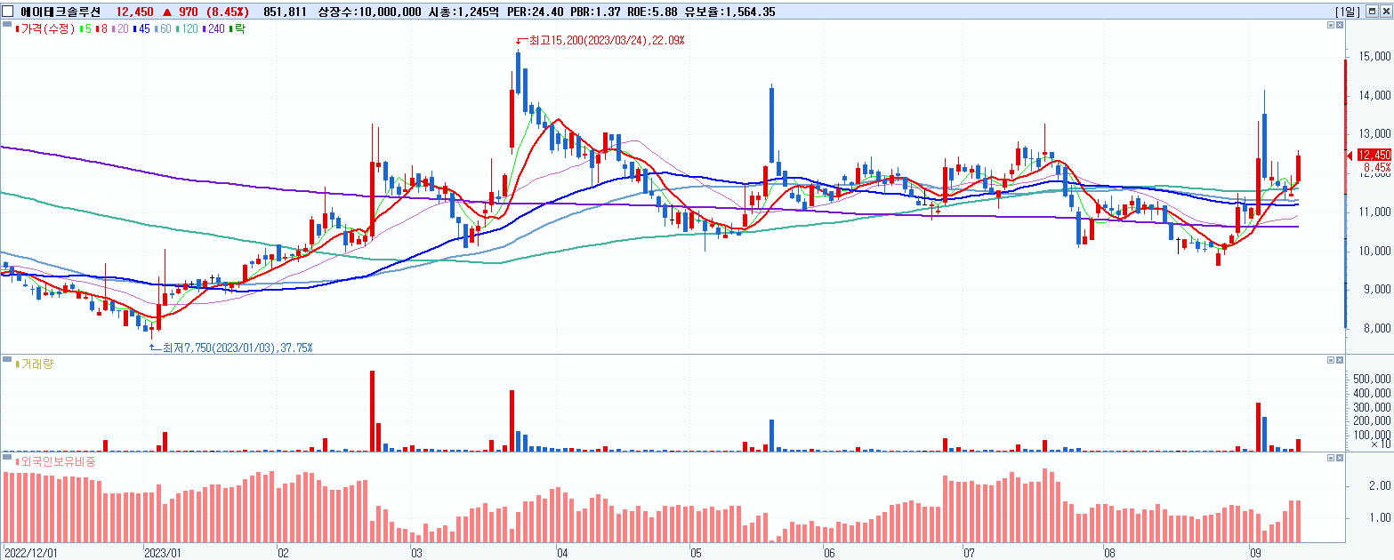 - 에이테크솔루션 (12,450원 ▲ 8.45% , 시총: 1,245억, 거래량: 852,266, 거래대금:104억)