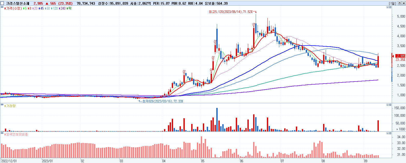 - 크리스탈신소재 (2,985원 ▲ 23.35% , 시총: 2,862억, 거래량: 70,807,818, 거래대금:2,120억)