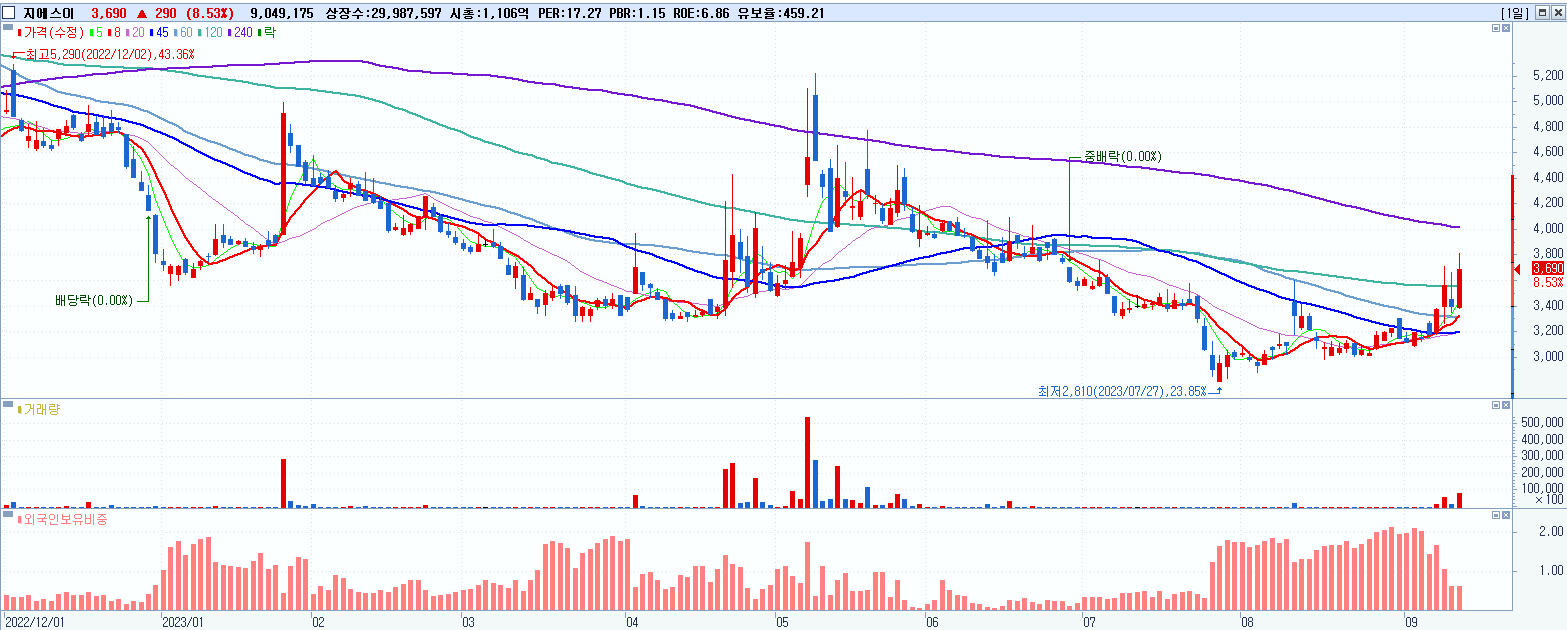 - 지에스이 (3,690원 ▲ 8.53% , 시총: 1,107억, 거래량: 9,121,130, 거래대금:334억)