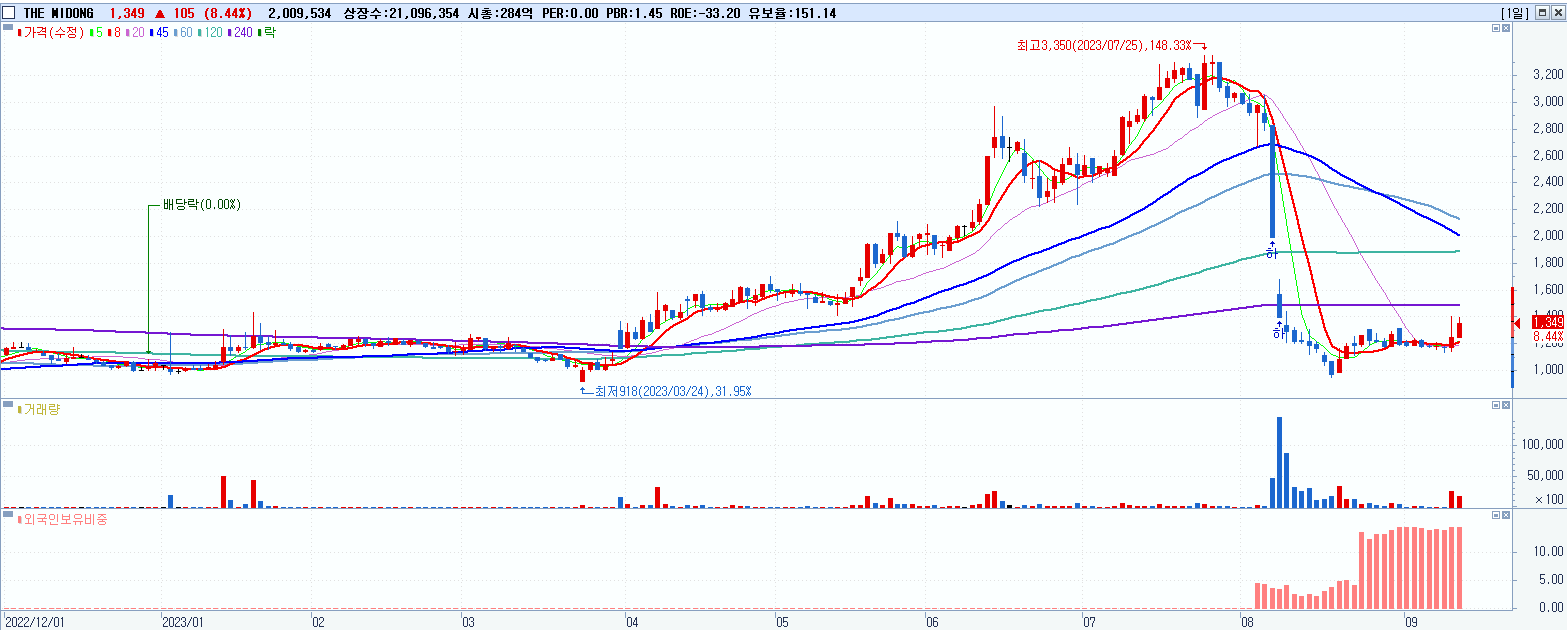 - THE MIDONG (1,349원 ▲ 8.44% , 시총: 285억, 거래량: 2,009,534, 거래대금:27억)