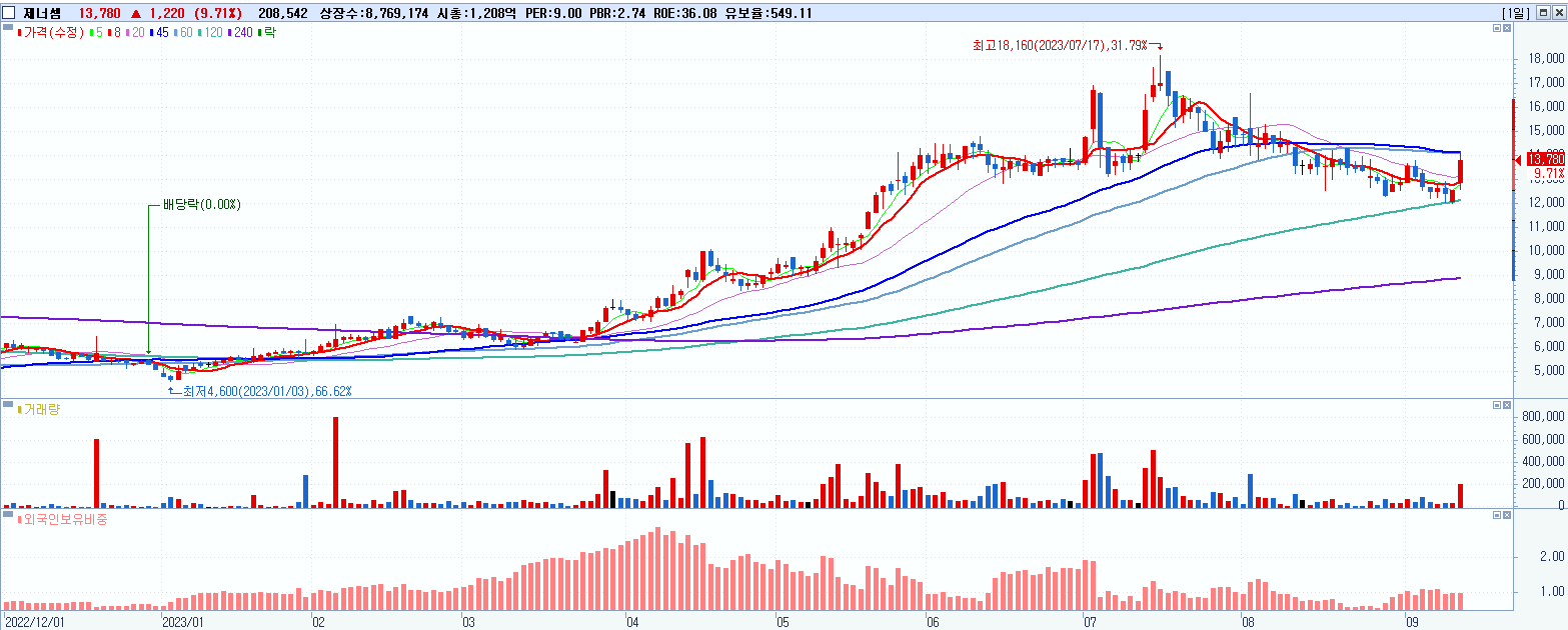 - 제너셈 (13,780원 ▲ 9.71% , 시총: 1,208억, 거래량: 208,542, 거래대금:29억)