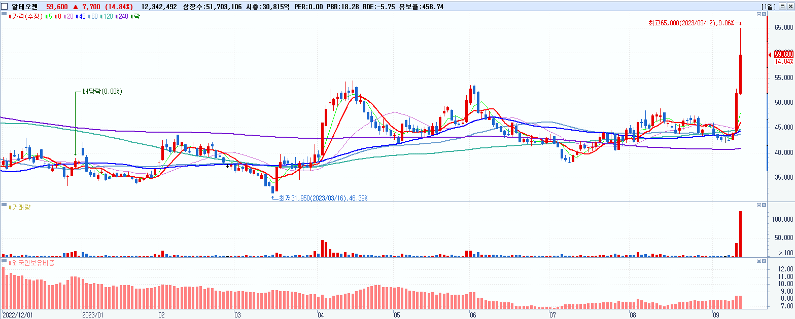 - 알테오젠 (59,600원 ▲ 14.84% , 시총: 30,815억, 거래량: 12,383,139, 거래대금:7,369억)