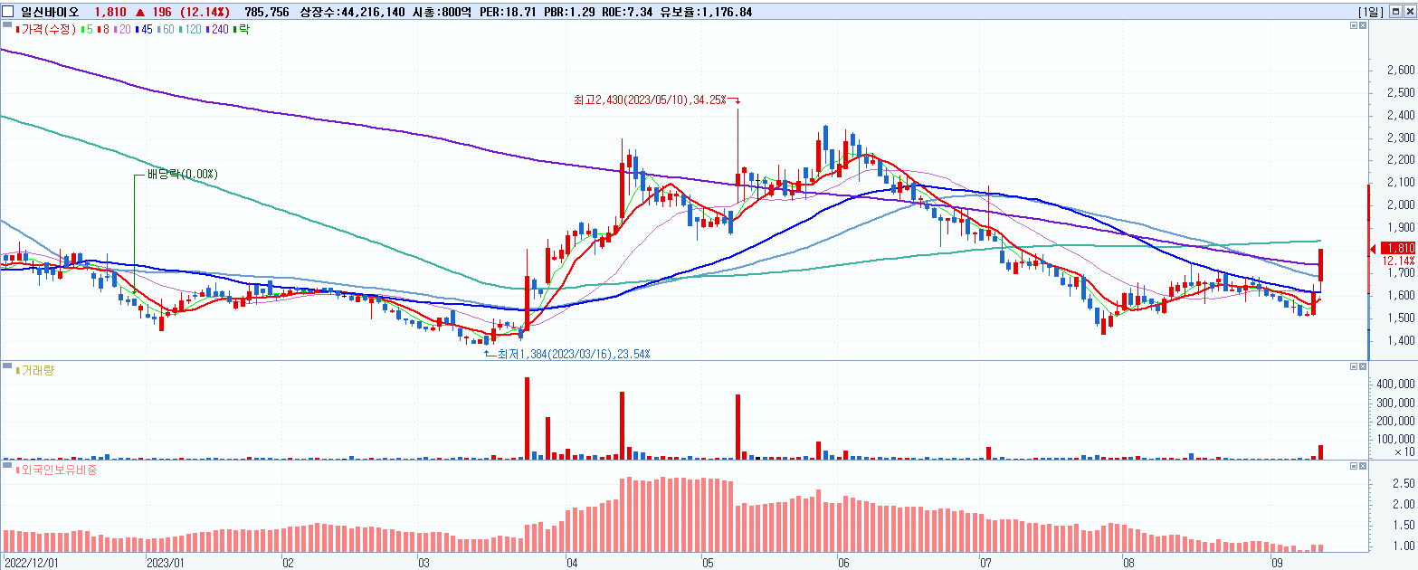 - 일신바이오 (1,810원 ▲ 12.14% , 시총: 800억, 거래량: 786,430, 거래대금:14억)
