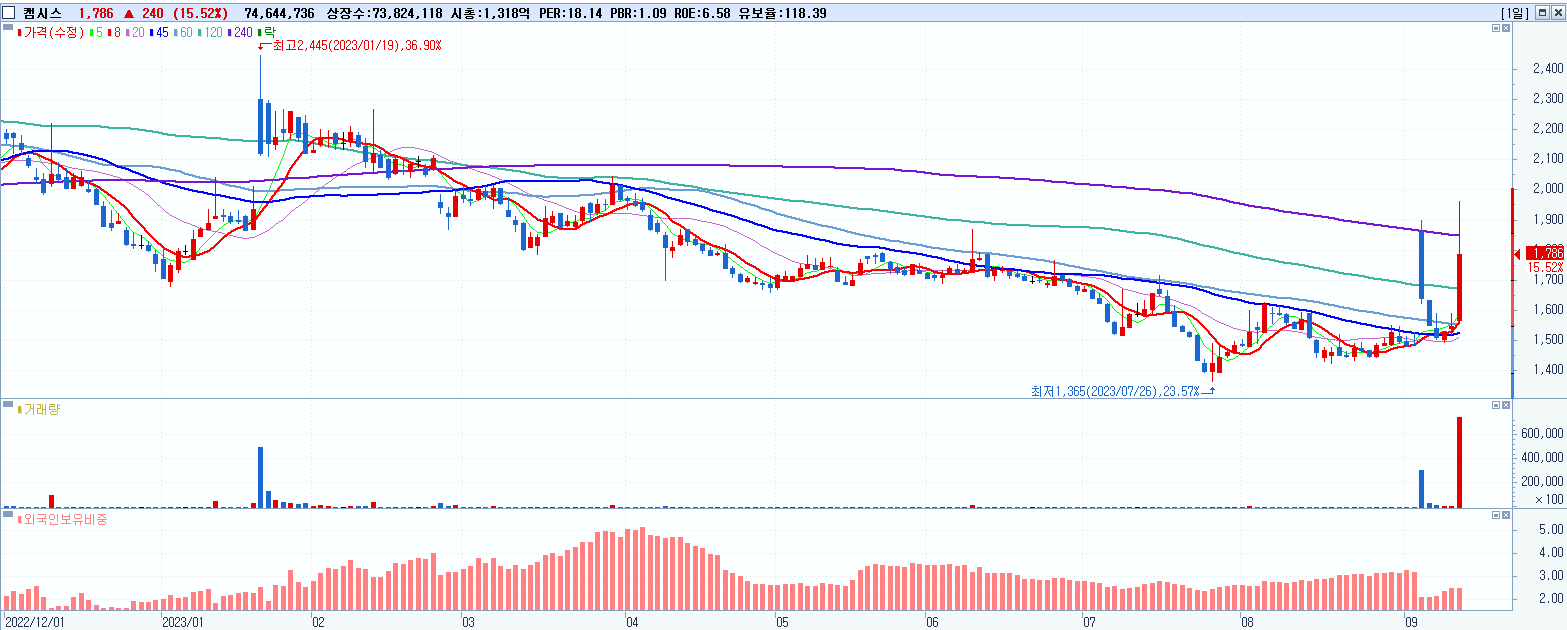 - 캠시스 (1,786원 ▲ 15.52% , 시총: 1,318억, 거래량: 74,668,289, 거래대금:1,363억)