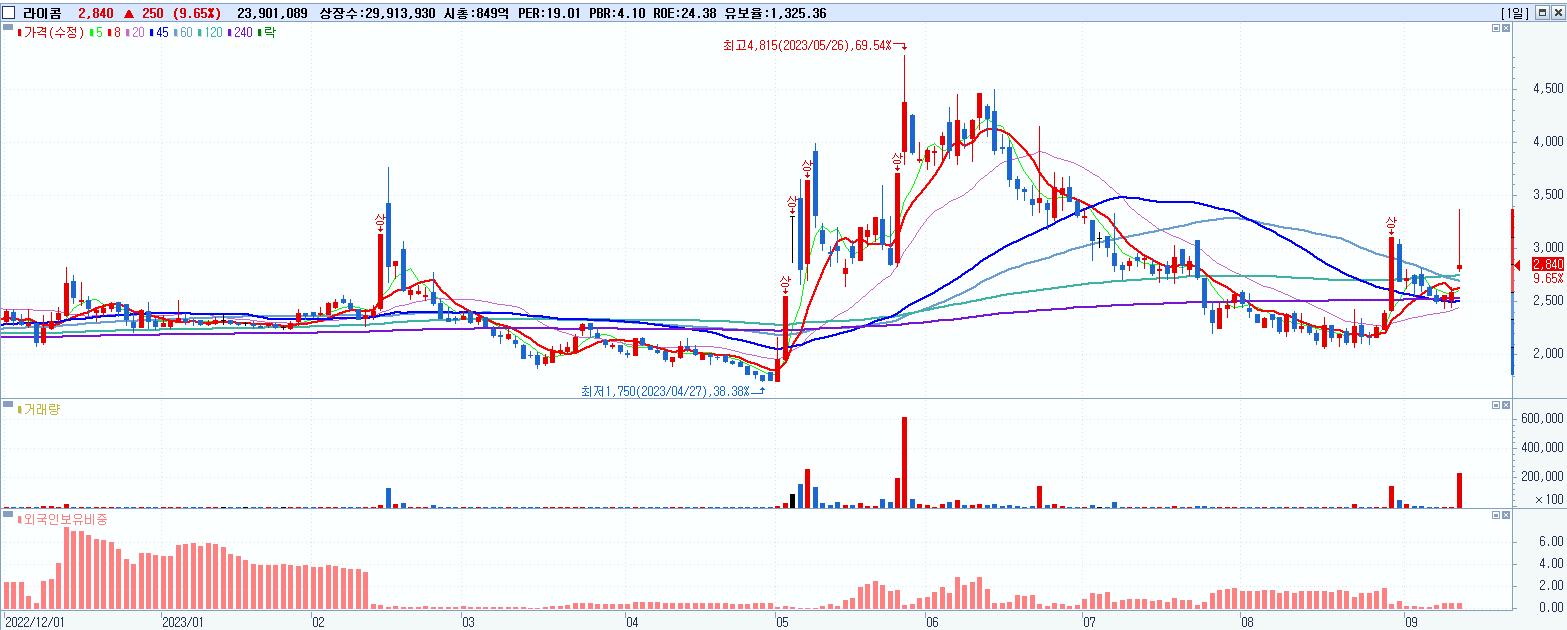 - 라이콤 (2,840원 ▲ 9.65% , 시총: 850억, 거래량: 23,907,472, 거래대금:763억)