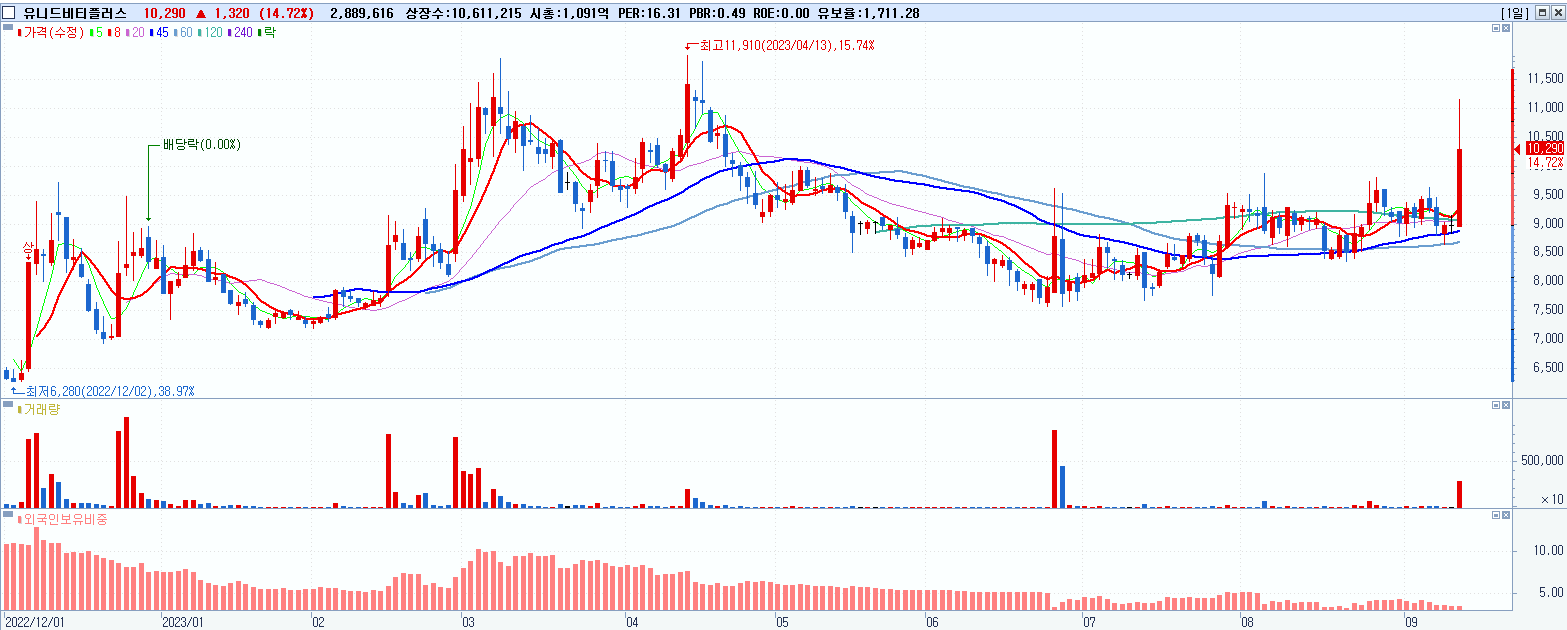 - 유니드비티플러스 (10,290원 ▲ 14.72% , 시총: 1,092억, 거래량: 2,890,260, 거래대금:301억)