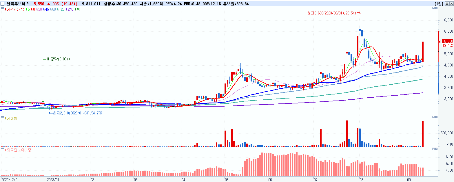 - 한국무브넥스 (5,550원 ▲ 19.48% , 시총: 1,690억, 거래량: 9,814,779, 거래대금:536억)