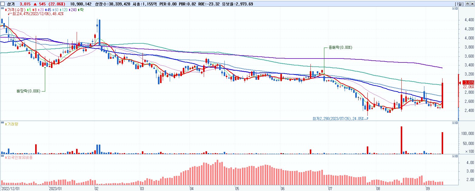 - 삼기 (3,015원 ▲ 22.06% , 시총: 1,156억, 거래량: 11,044,269, 거래대금:321억)