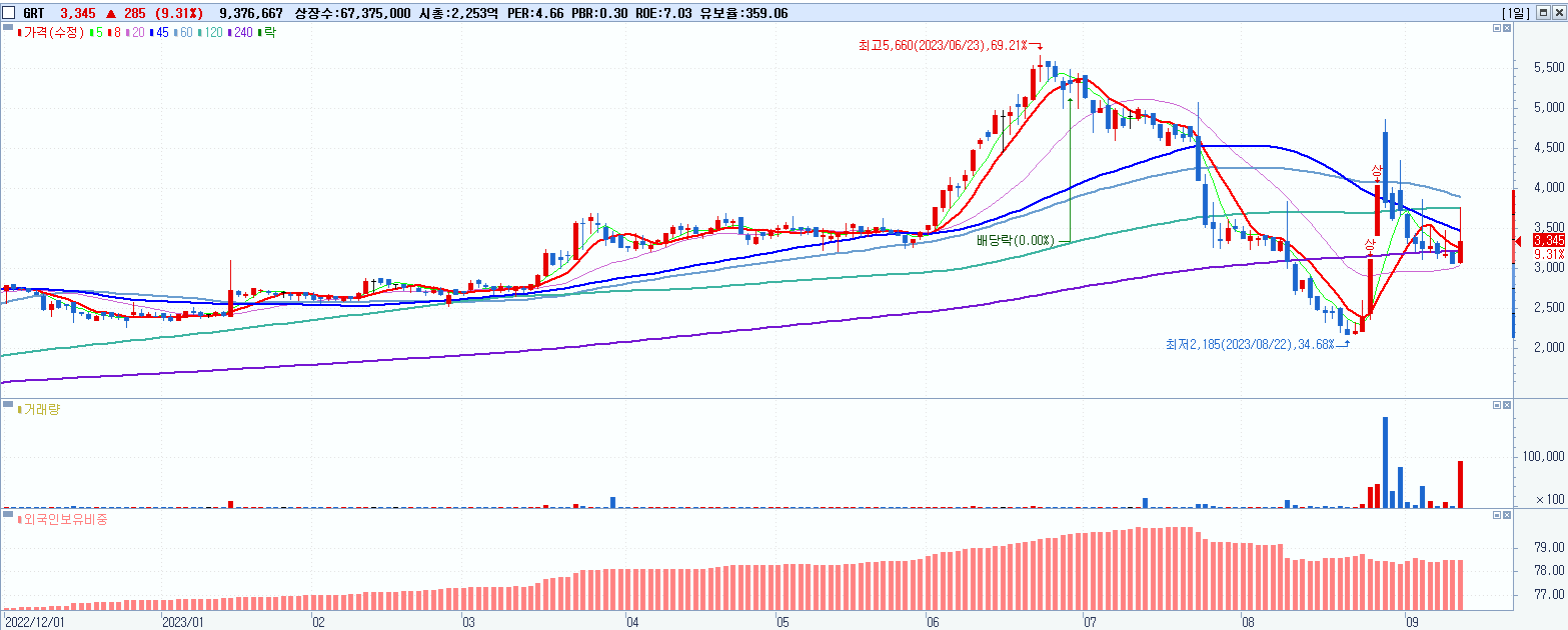 - GRT (3,345원 ▲ 9.31% , 시총: 2,254억, 거래량: 9,377,289, 거래대금:333억)