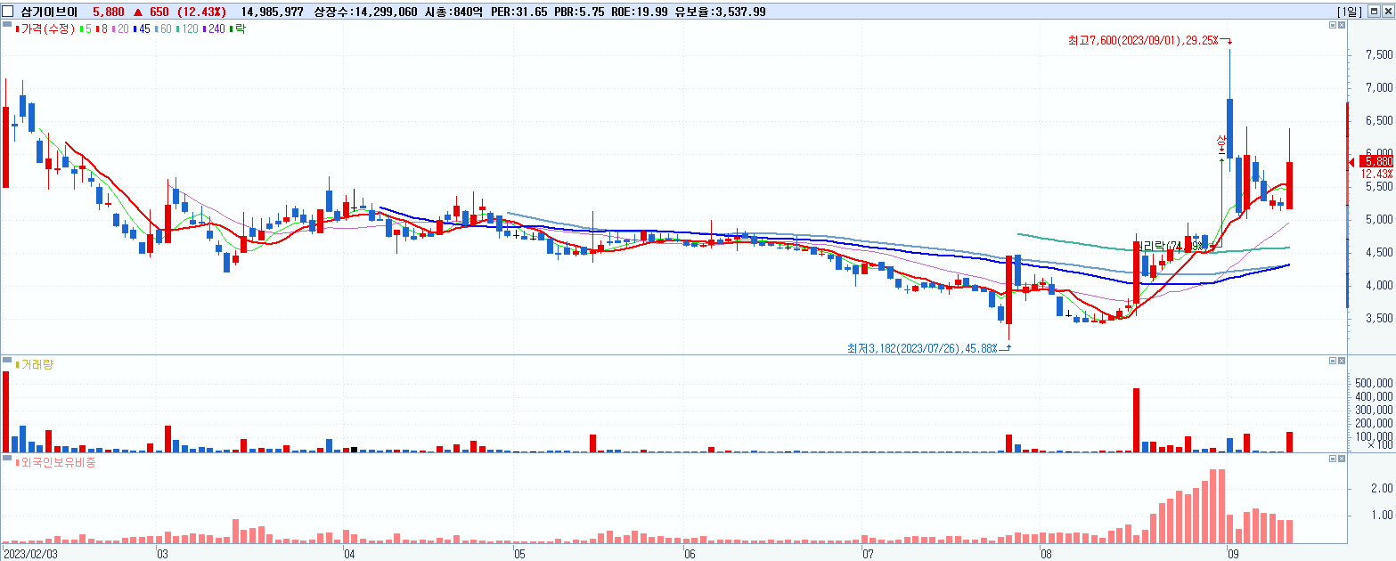 - 삼기이브이 (5,880원 ▲ 12.43% , 시총: 841억, 거래량: 14,993,594, 거래대금:889억)
