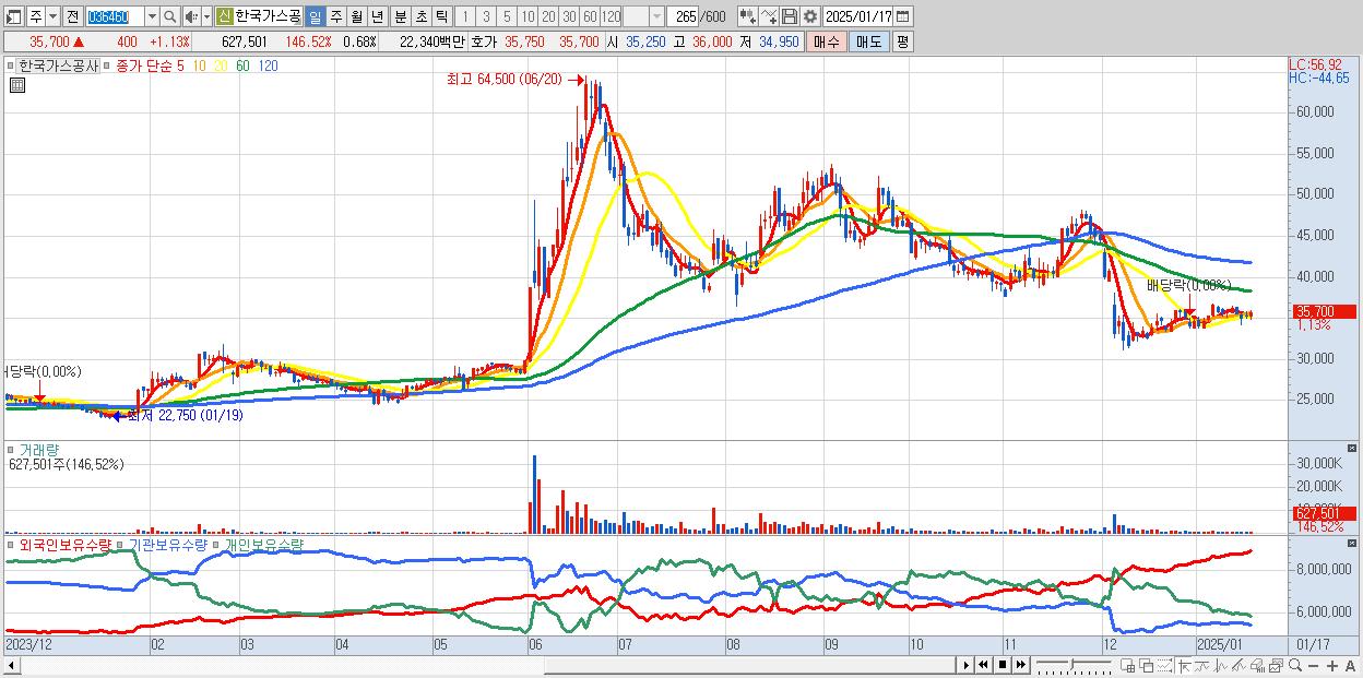 - 한국가스공사 (35,700원 ▲ 1.13% , 시총: 32,956억, 외국인 순매수 거래금:51억)