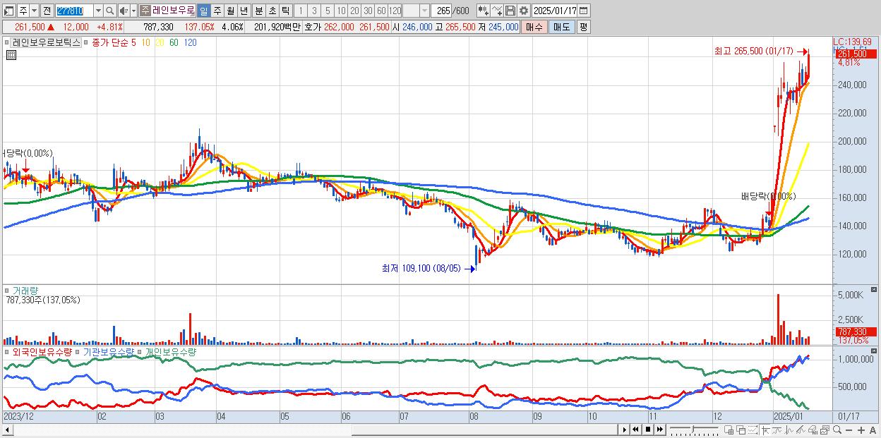 - 레인보우로보틱스 (261,500원 ▲ 4.81% , 시총: 50,731억, 외국인 순매수 거래금:69억)