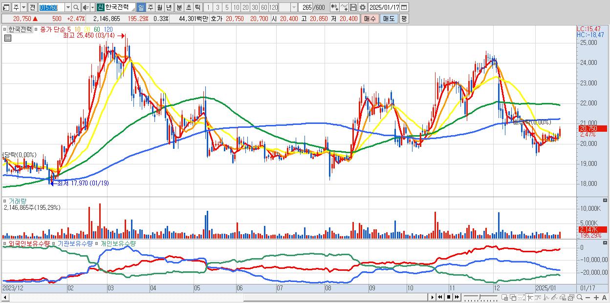 - 한국전력 (20,750원 ▲ 2.47% , 시총: 133,208억, 외국인 순매수 거래금:89억)
