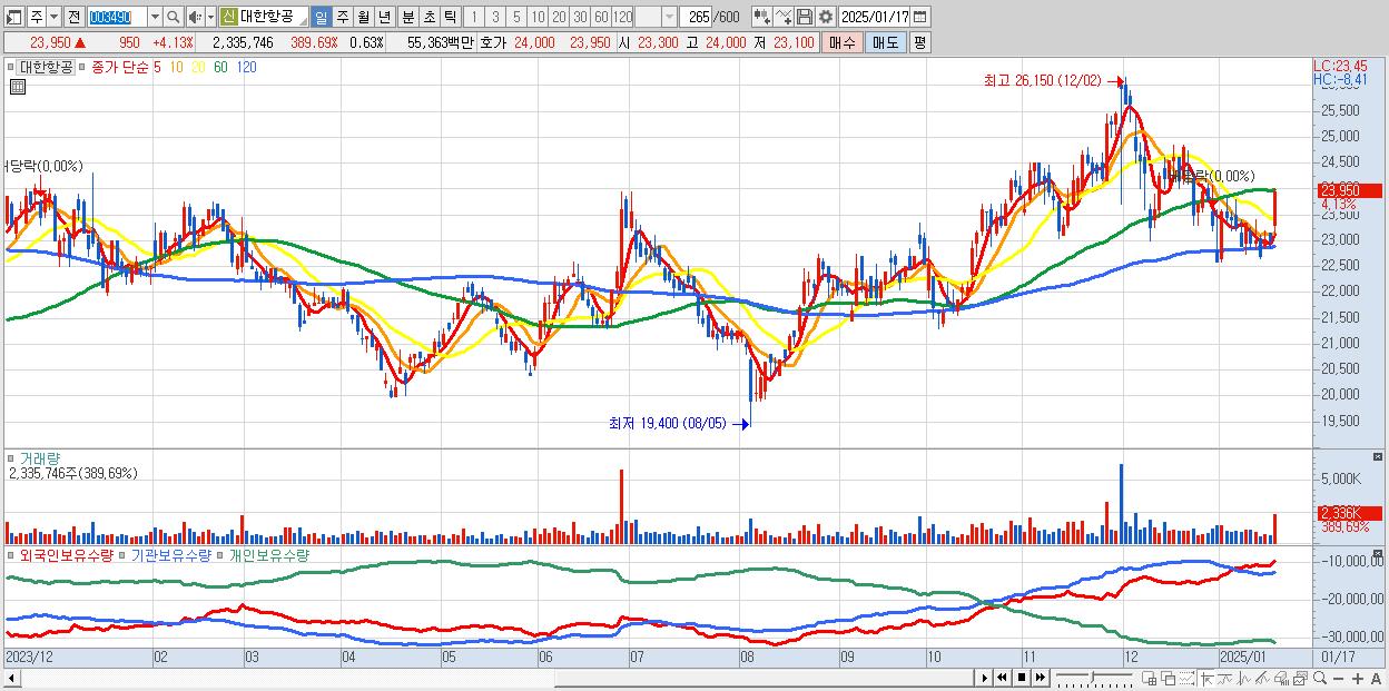 - 대한항공 (23,950원 ▲ 4.13% , 시총: 88,189억, 외국인 순매수 거래금:104억)