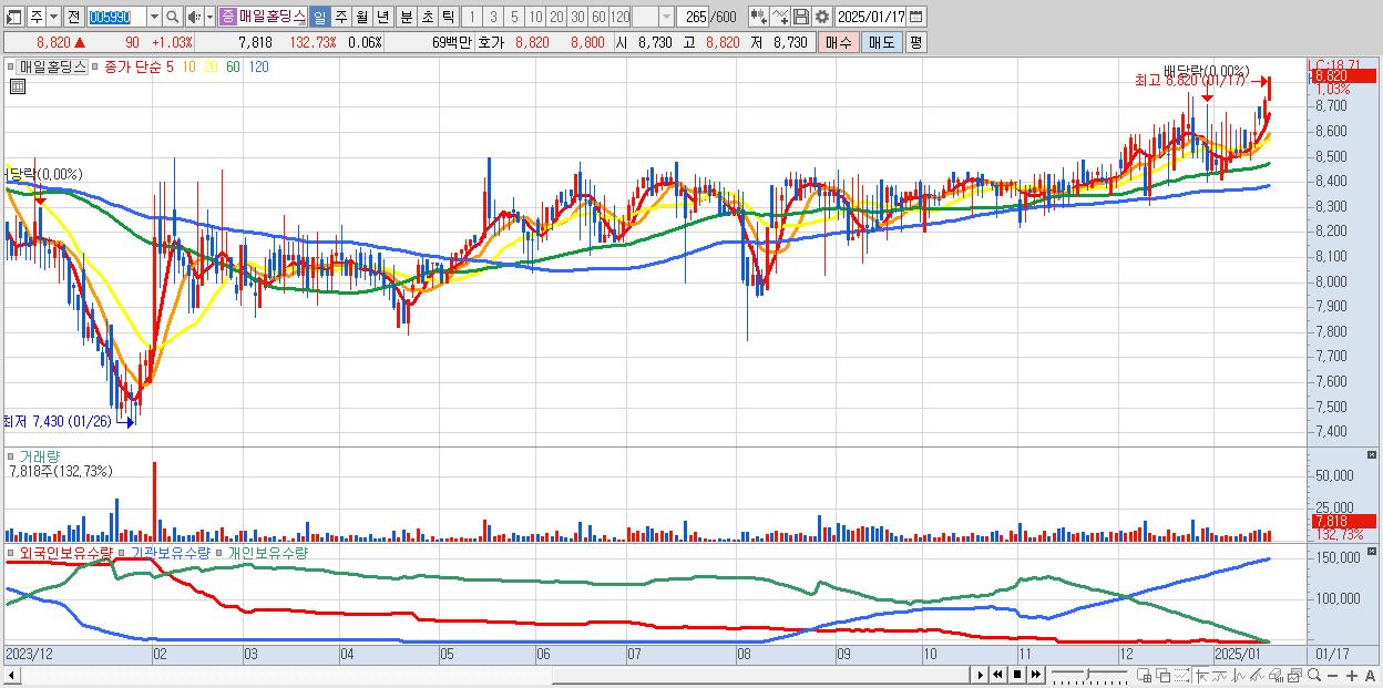 - 매일홀딩스 (8,820원 ▲ 1.03% , 시총: 1,210억, 거래량: 7,818, 거래대금:1억, KOSDAQ)