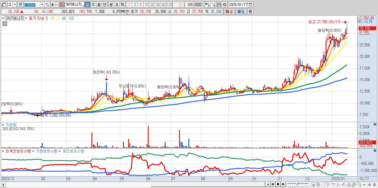 - SNT에너지 (26,100원 ▲ 0.19% , 시총: 5,398억, 거래량: 263,823, 거래대금:69억, KOSPI)