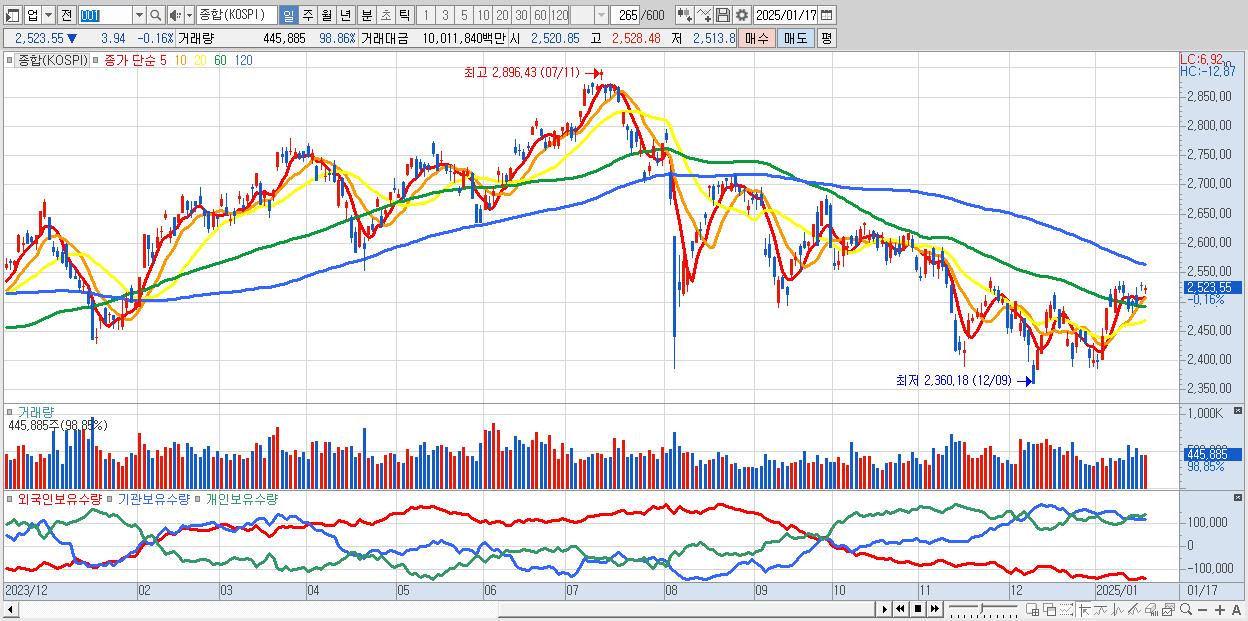 | 01/17 | 2,523.55 | ▼-0.16% | 2,864억 | -2,331억 | -1,007억 | 473억 |