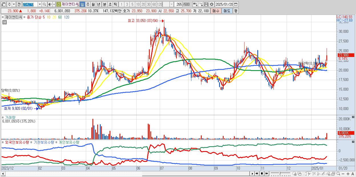 - 제이앤티씨 (23,900원 ▲ 8.14% , 시총: 13,826억, 외국인 순매수 거래금:36억)