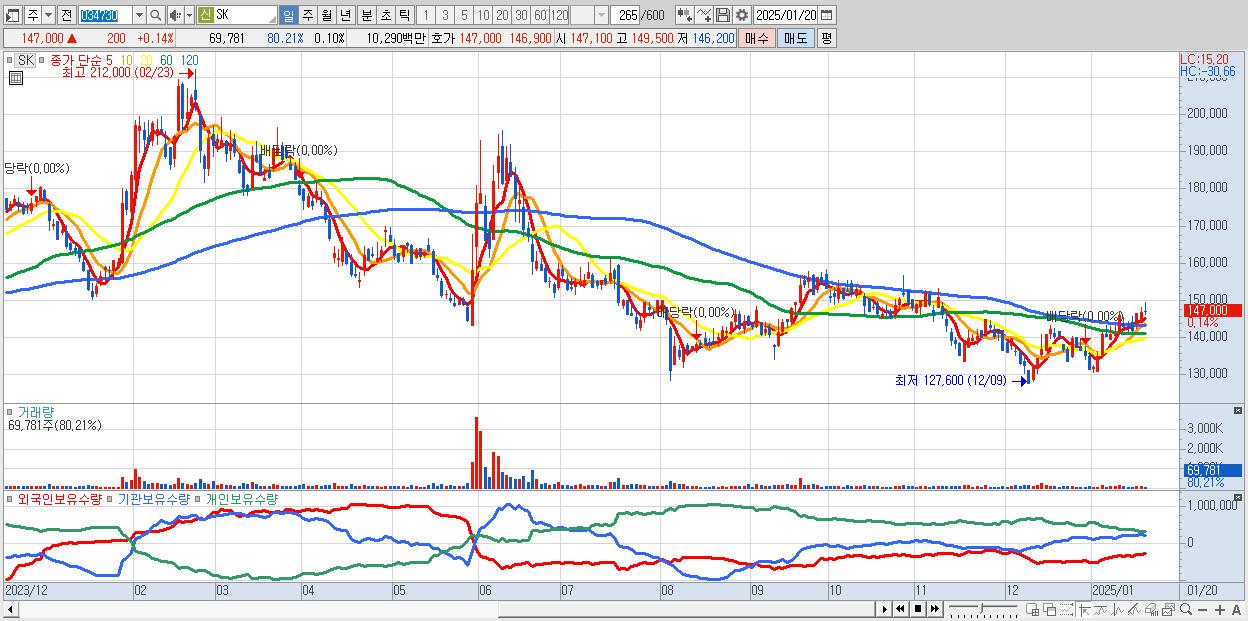 - SK (147,000원 ▲ 0.14% , 시총: 106,579억, 외국인 순매수 거래금:27억)