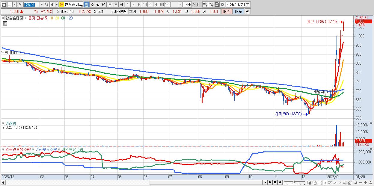 - 한솔홈데코 (1,080원 ▲ 7.46% , 시총: 870억, 거래량: 2,862,110, 거래대금:30억, KOSPI)