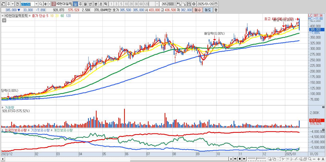 - HD현대일렉트릭 (385,000원 ▼ -7.89% , 시총: 138,781억, 거래량: 928,873, 거래대금:3,701억)