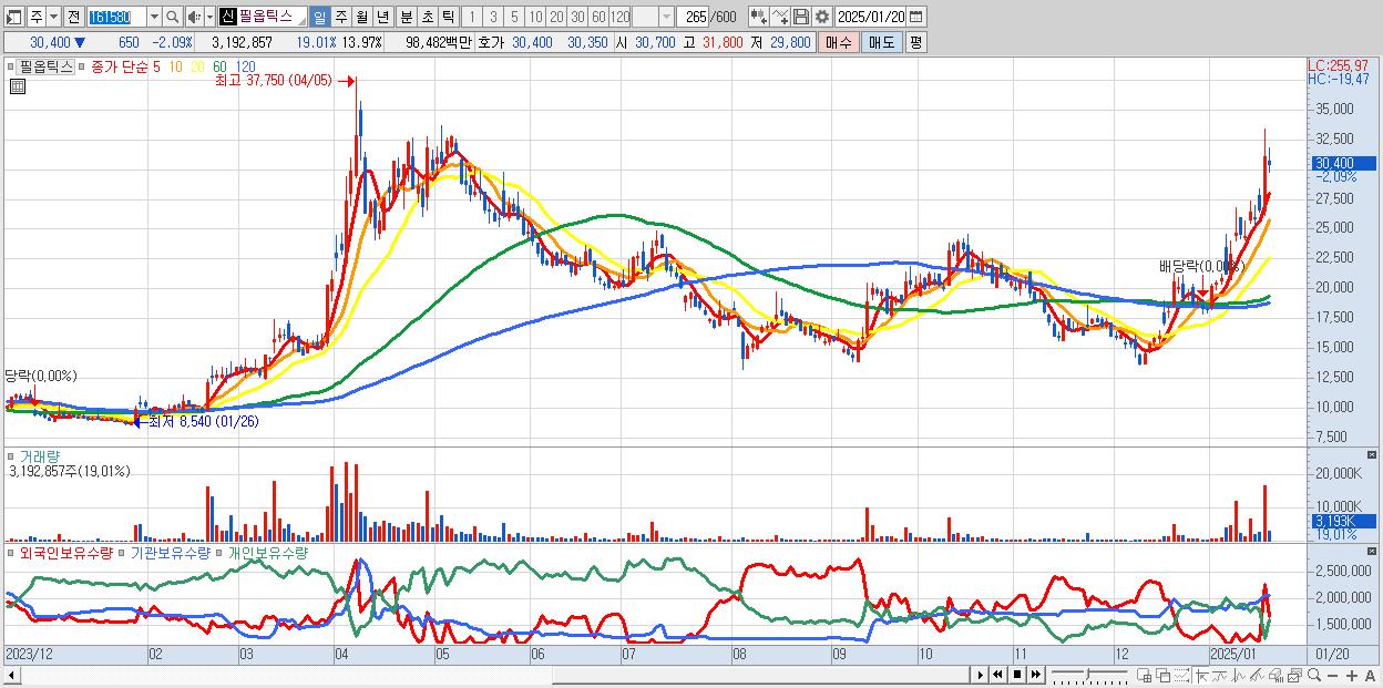 - 필옵틱스 (30,400원 ▼ -2.09% , 시총: 6,946억, 거래량: 3,192,857, 거래대금:985억)
