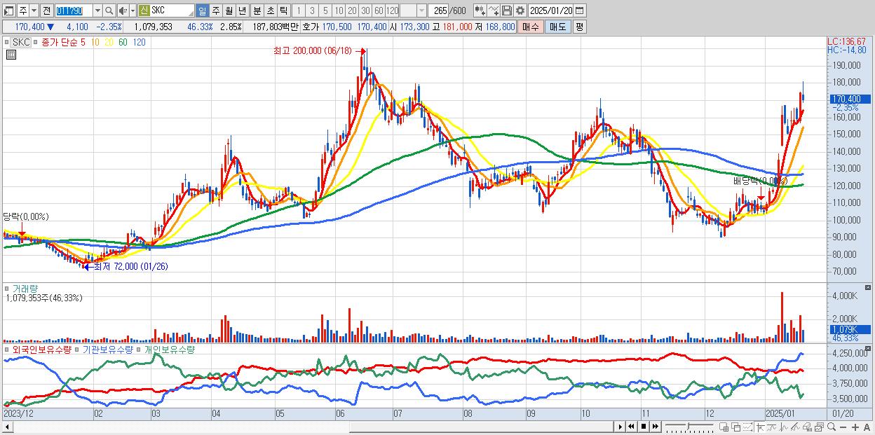 - SKC (170,400원 ▼ -2.35% , 시총: 64,528억, 거래량: 1,079,353, 거래대금:1,878억)