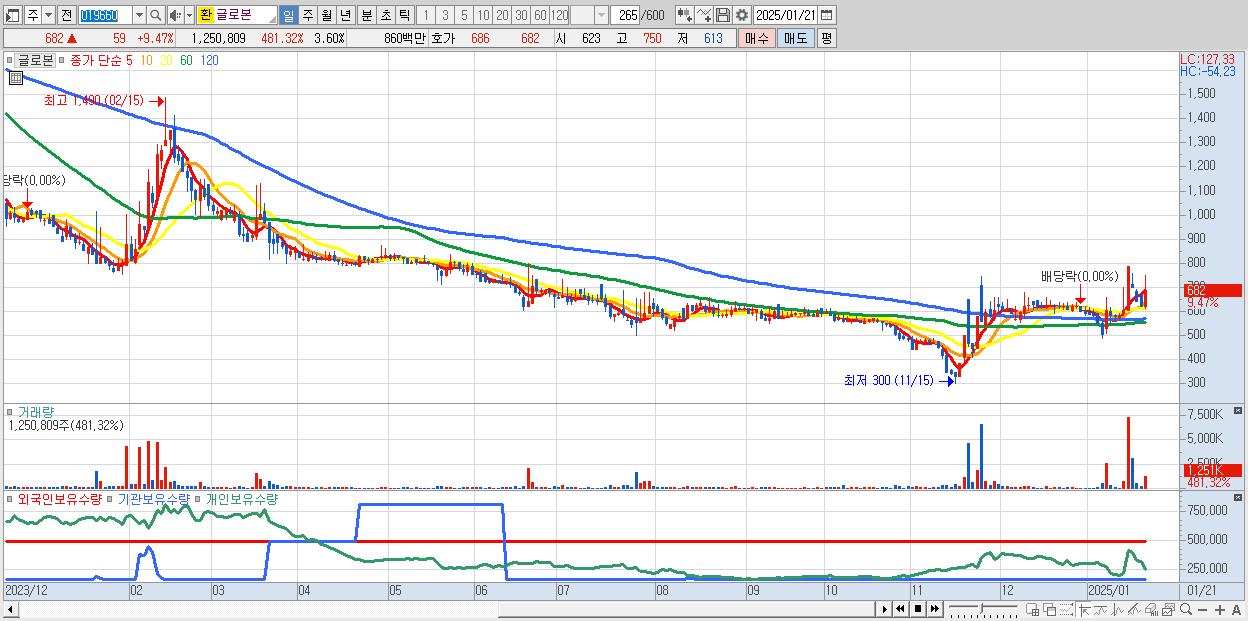 - 글로본 (682원 ▲ 9.47% , 시총: 237억, 거래량: 1,250,809, 거래대금:9억)