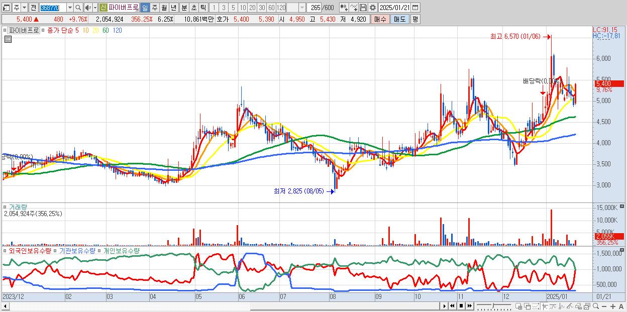 - 파이버프로 (5,400원 ▲ 9.76% , 시총: 1,774억, 거래량: 2,054,924, 거래대금:109억)