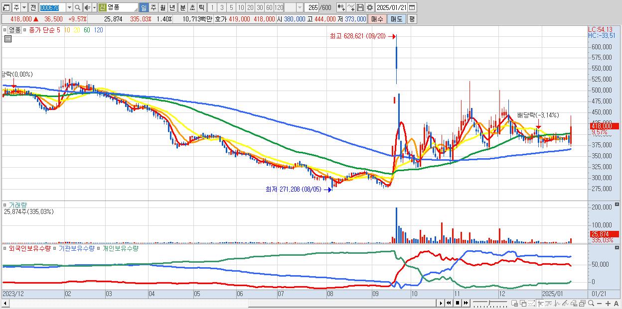 - 영풍 (418,000원 ▲ 9.57% , 시총: 7,700억, 거래량: 25,874, 거래대금:107억)