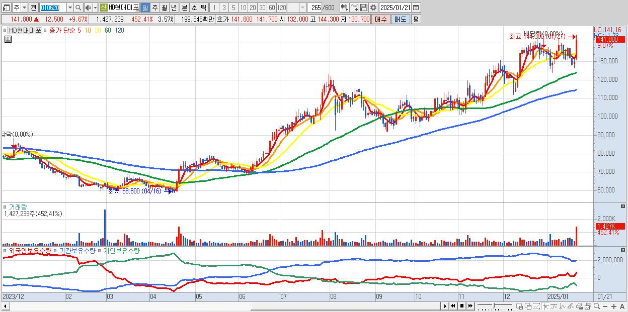 - HD현대미포 (141,800원 ▲ 9.67% , 시총: 56,638억, 거래량: 1,427,239, 거래대금:1,998억)