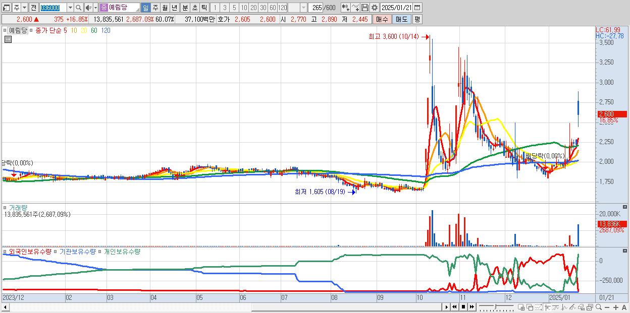 - 예림당 (2,600원 ▲ 16.85% , 시총: 599억, 거래량: 13,835,561, 거래대금:371억)